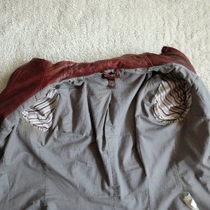 Pre-loved asymetric zipper jacket from Danier. It has two pockets (left side is a deeper pocket) with zippers. The cuffs can also be unzipped or zipped for more variety.