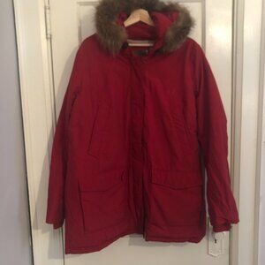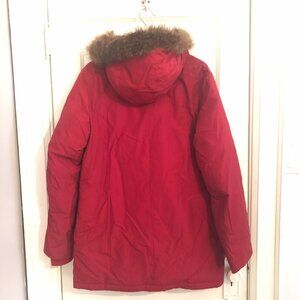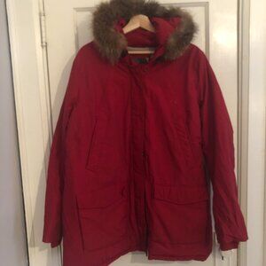 Cold weather parka. Red outside with silver lining. Designed in Canada. Water resistant. Long sleeve. Fur trim hood (fur is removable). Dry clean only.
