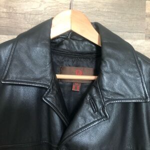 Classic black leather coat by Danier. Timeless design with button closure. Fully lined. Ideal for stylish layering.