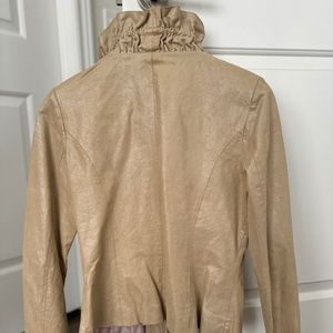 Tan Danier suede zip-up bomber with a super cute ruffled collar. It's made in Danier’s iconic shimmer suede leather with a beautiful striped liner. It works well with high-waisted jeans or over a fitted dress. Circa mid-2000s.