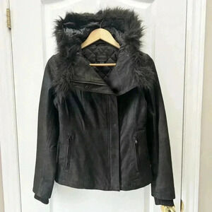 Danier Faux Fur Trim Hooded Suede Bomber Jacket