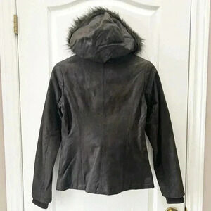 Danier Suede Bomber Jacket Hooded Faux Fur Trim Chocolate Brown Size 2XS