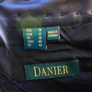 Jacket has a smooth leather collar detail and the skirt has a smooth finished leather waist.