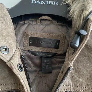 Purchased from Danier Leather, only worn once. Authentic suede type leather. The jacket is in great condition. Size XS but is a bomber jacket so room to wear sweaters underneath. The colour is grey/brown.