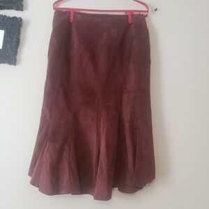 High-low midi suede leather skirt. fully lined. side zip closure. Great preowned condition in Brown