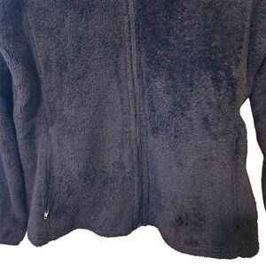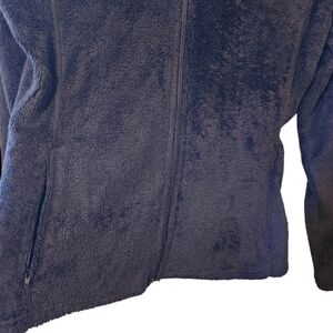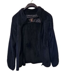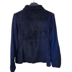 Danier, black polyester, zip-up, long-sleeve sweater coat. Zip-up front, two front zip-up pockets, Fold-down collar, stretchy elastic cuffs. Super warm, comfortable,stretchy sweater in great condition size M