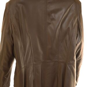 Chocolate brown leather jacket, by Danier Leather. It is a buttoned, mid-lenght jacket with a removable Thinsulate lining. The lining is in the body portion. It has had very little use and is in excellent condition, no marks or wear. The colour is a dark chocolate brown, some of the photos make it look slightly more yellow than it is. The colour in the first photo is the most accurate.