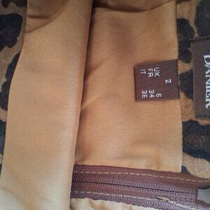 Genuine soft leather with a soft suede feel. 14 inch waist lying flat and 13 inches long. 2 zippers , in the back one at waist and one at hem. Perfect!