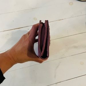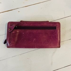 Brand new distressed magenta leather Danier wallet with multiple compartments.