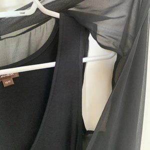Danier stretch rayon elastane mini dress that has loose criss crossing sheer pieces over it. The dress is very stretchy and can fit a size 2 to 4. If you have any questions, please et me know. Its a little difficult to capture the features of the dress because its black but you can see how its constructed in each picture. Excellent condition. I live in a smoke free and pet free environment.