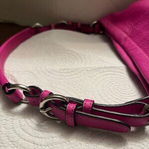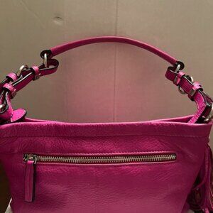 Size 11” X7”. Strap 21”. Color fuchsia pink. Material: 100% calf leather, silver tone metal hardware, inner fabric lining. Trending clutch style with strap. Fringe tassel charm. Outer pocket with zipper. Inner pocket with zipper and 2 slip pockets inside. In excellent condition.