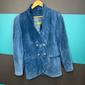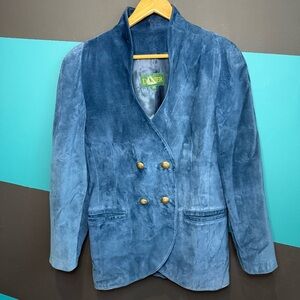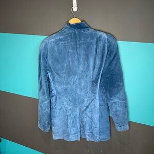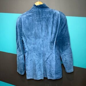 This Danier suede blazer and skirt set showcases a rich blue hue in a luxurious fabric, offering a tailored silhouette with structured lapels. Its classic design makes it a versatile choice for both casual and semi-formal occasions.