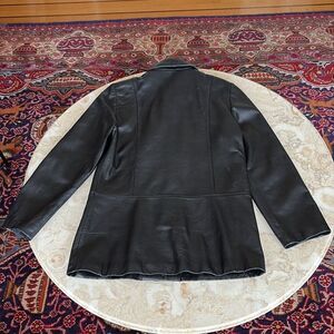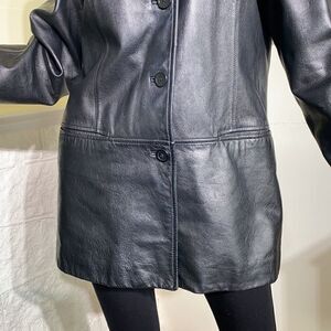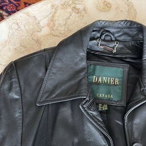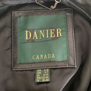 Size US 8-10 or Canada size small Danier black leather mod style car length coat in very good preowned condition. Leather is supple with barely any signs of wear, please note inner zippered liner is missing.