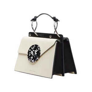 The luxurious two-tone Phoebe Bis bag from Danse Lente is made with a mix of Dove and Black leathers, and features an elegantly structured silhouette, silver-tone hardware, a long cross body strap, the signature spiral top handle with a leather strap, embossed logo lettering at the front, and an unsymmetrical flap with a bold marbled acetate circle. The two accordion-like compartments are secured with magnetic closures, and open to suede and fabric-lined interiors, with the front compartment containing one pouch pocket.