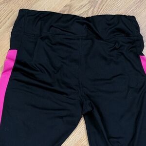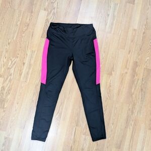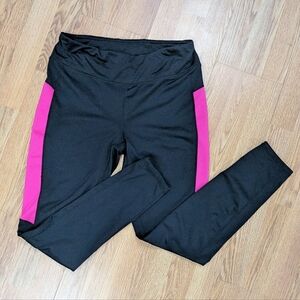 These Danskin leggings feature a sleek black design with vibrant pink side panels, crafted from a smooth, stretchy performance fabric. The form-fitting style and wide waistband ensure comfort and support during any athletic activity. Ideal for workouts or casual wear, these full-length leggings offer both style and functionality.