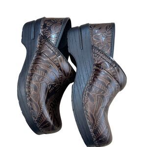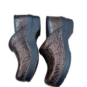 Dansko Professional Brown Tooled Embossed Floral Leather Closed Back Clog Shoes