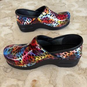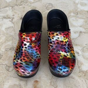 In excellent preowned condition, gorgeous, patent leather professional, Dansko clogs in the style called “paint storm”.
