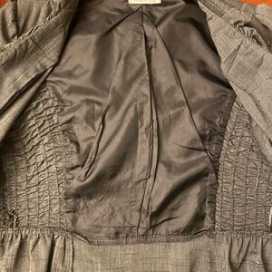 Dark Academia Women’s Grey Blazer with beautiful feminine details. Ruffled collar, smocked sides and peplum style waist. Very light weight, partially lined.