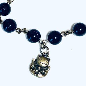 Dark Blue Goldstone Bronze Link Adjustable Short Necklace w/ Fortune Cat Charm