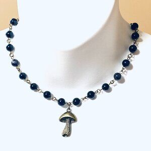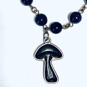 Dark Blue Goldstone Bronze Link Adjustable Short Necklace w/ Slim Mushroom Charm