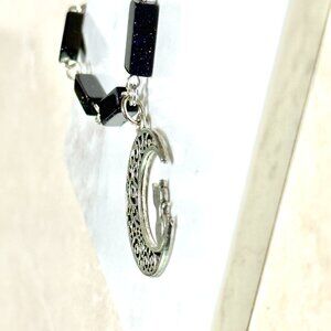 14 mm x 5 mm dark blue goldstone rectangular beads, 30 mm silver alloy "Cat on the Moon" pendant