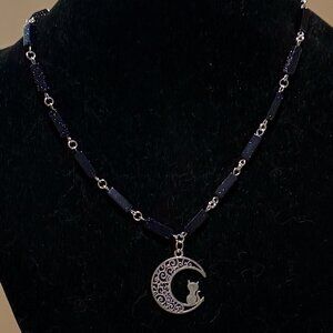 Dark Blue Goldstone Short Necklace w/ Silver Cat on the Moon Pendant