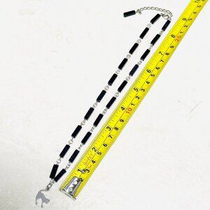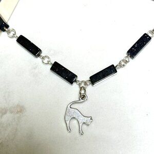 Dark Blue Goldstone Short Necklace w/ Silver Cute Slim Cat Pendant