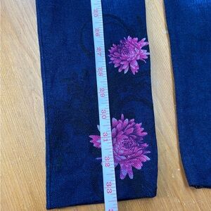 Chic dark blue cotton pants featuring vibrant pink floral accents, a trendy look. Comfy, casual, riding pants.