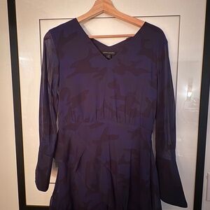Dreamy dark blue dress, sheer arms and details, lined, botton sleeves, side zip. 4 petite.