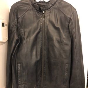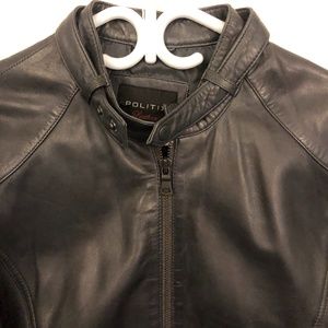 This premium quality Genuine Politix soft lamb leather jacket is in excellent condition. Its size M but fits like a small. the colour is 'textured dark blue'.