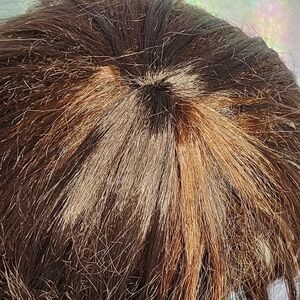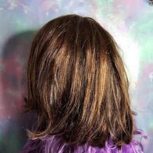 Dark Brown Bob Synthetic Wig w/ Caramel Bronze Highlights & Bangs - in great condition.