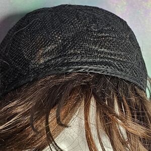 Dark brown bob that falls just below the chin with gorgeous blunt bangs & caramel bronze highlights throughout. Standard size cap without adjustable clips, but will fit most heads.