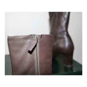 Dark brown booties feature an almond toe front, zip closure at sides. Minor wrinkles on the leather.