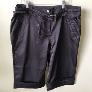 Stylish dark brown bermuda shorts with tiered detail on the front pockets, hems, and 2 strap adjustable belt. Material is soft with a nice shine to it in a rich dark chocolate brown. Brand new with tags, never worn.