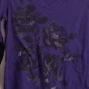 A beautiful, rarely worn, long sleeve top in deep purple with black and silvery flowers on the front.