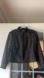 Edgy well constructed blazer. Ribbon and piping details. Row of hook and eye enclosures along front. Very tailored - cinches you in. Contrast tan stitching over dark gray substantial cotton blend. Fully lined. See measurements and fabric details in pics - has a little stretch.
