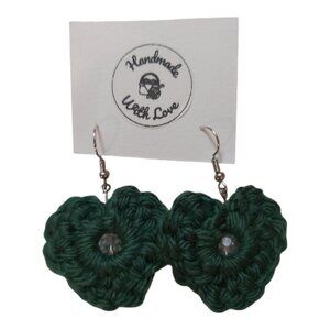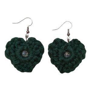 Dark Green Crochet Heart Earrings with Glass Bead • Handmade