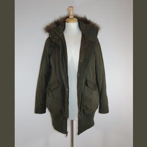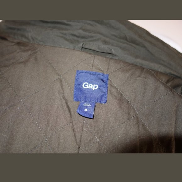Dark Green Gap Jacket - size M. Cover-your-butt-length jacket, great deep pockets. Quilted lining, zipper and buttons to close. Detachable faux fur trim on hood. Bought at GAP Japan, size M (size 6-8 US). This is not a puffer jacked, it's a warn but light weight jacket for spring/fall. Worn several times but in great shape. Note there is some pilling on the inside on the band, see photos for details. Timeless look.