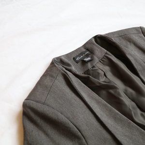 Dark grey fitted ladies blazer. Buttonless with dual zipper pockets.