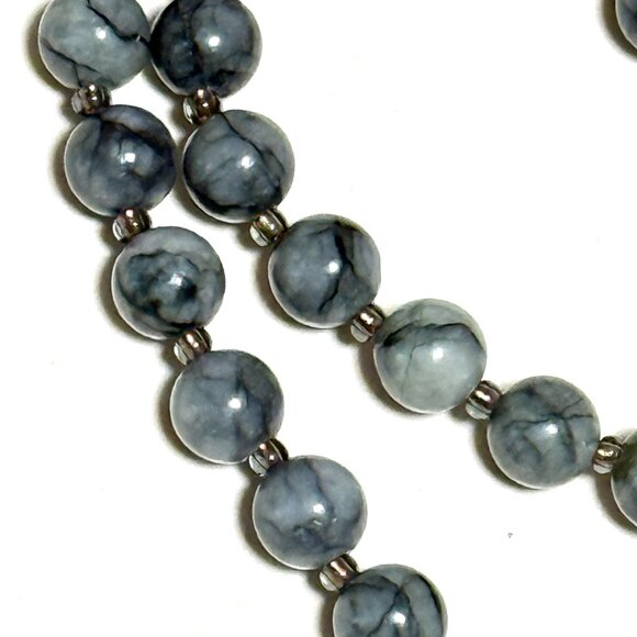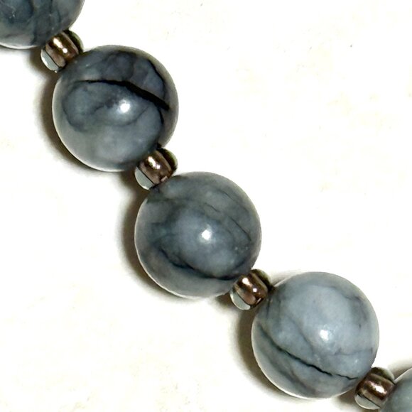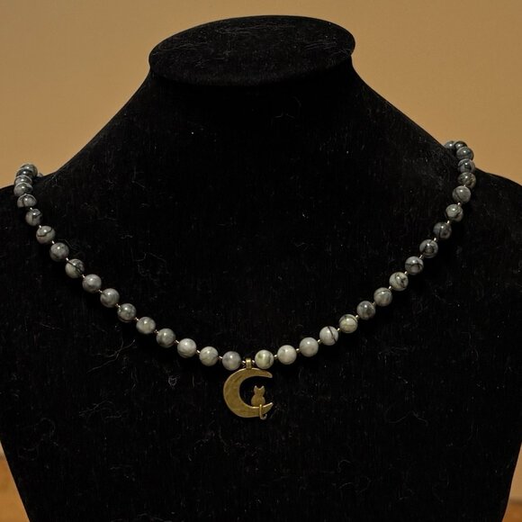 Dark Grey Marble Short Necklace, Genuine Gemstone & Bronze Cat on the Moon Charm