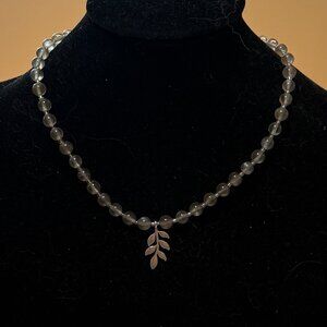 6 mm dark moonstone round beads, 2 mm silver tone glass spacers, 25 mm silver color leaf-branch pendant