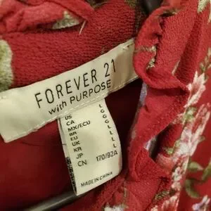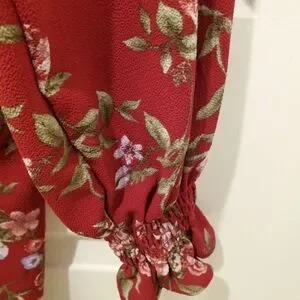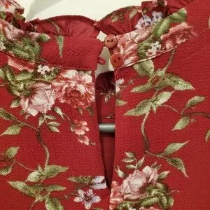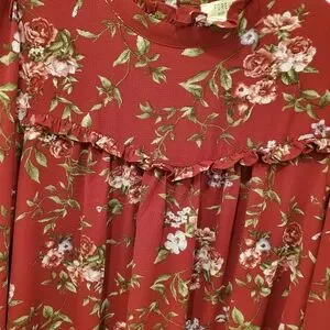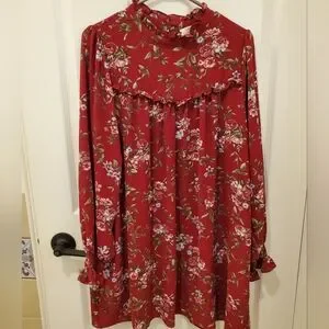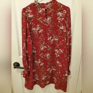 Like new, worn once. Floral high neck long sleeve mini dress, Raspberry colour, size L, loose and flowy, lined, long sleeve with elasticated ruffle cuffs, button closure, ruffle detailing, hits above knee, very pretty florals, feminine.