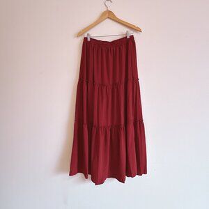 Dark Red Elastic Tie Waist Tiered Maxi Skirt
