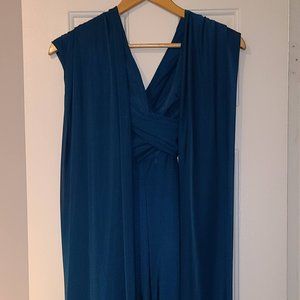 Dark teal/turquoise blue colour adjustable/convertible dress, above the knee.