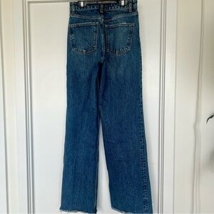Dark blue wide leg jeans. Raw hem at bottom, full length. Upgrade your wardrobe with these classic blue denim jeans. Perfect for any casual occasion, these jeans offer both style and comfort.