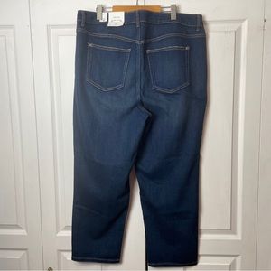 Dark denim is slim leg style with distressing at hem edges/pockets. Marked as size 20 with plenty of stretch. Cotton/elastane blend.