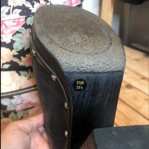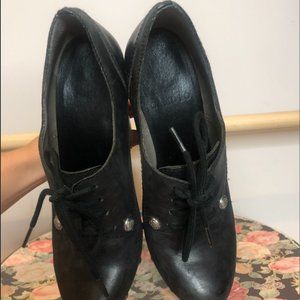 Surprisingly comfortable dark academia leather lace up oxfords. The wooden heel is approx 4.5”, with a 1” front.
