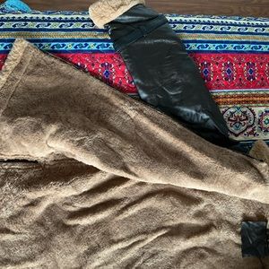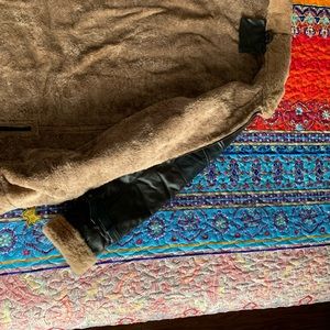 Brand new and never worn RAF Aviator Style sheepskin leather coat. Dark chocolate brown with faux fur lining. Soft, warm and very comfortable. Zippered closing with front side pockets and one arm pocket. Car cost length with two side zippers to create more comfort when seated. Purchased new but not big enough for me.