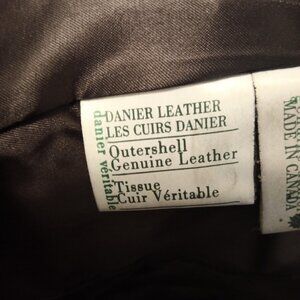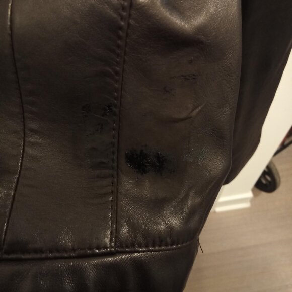 Old-school Danier Leather jacket. Decent condition. Has some markings on the leather from a sticky material that has dried up. Not sure if there's a way to remove it. I don't have any leather cleaning products.