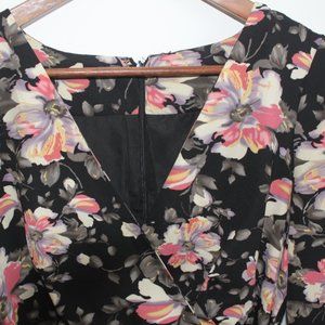 I wore this beautiful mini dress to a September wedding and loved it. The top is wrap-style look, the skirt is truly quite short. Zips up at the back and then there is a tie around the waist as well. There is a button missing on one sleeve (see pictures). The fabric a lined polyester.